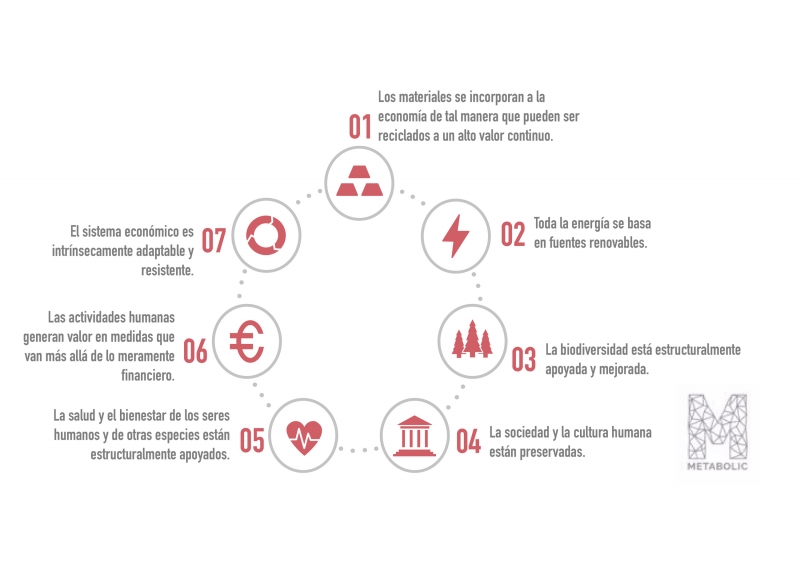 Metabolic - una empresa de consultoría y construcción de empresas que utiliza el pensamiento sistémico para hacer frente a los desafíos de la sostenibilidad global - tiene como objetivo siete pilares en los que debe mantenerse la economía circular. La literatura sobre el tema comparte otras sugerencias similares; no podemos encontrar una lista oficial. Estos siete pilares son una forma de abordar los problemas de forma sistémica y pueden utilizarse para evaluar la circularidad de los productos, proyectos, negocios y carteras de inversión. Estos son: