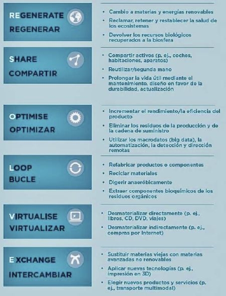 El marco ReSOLVE, desarrollado por McKinsey & Company, toma los principios básicos de la circularidad y los aplica a seis acciones: Regenerar, Compartir, Optimizar, Circular, Virtualizar e Intercambiar.