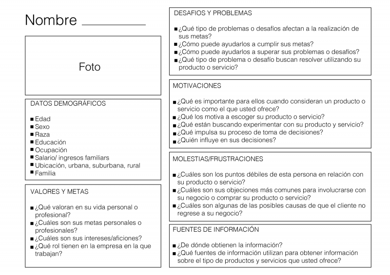 Si necesita ayuda para formular ambos aspectos, en el siguiente enlace hay conjunto de preguntas que pueden ayudarle a lo largo del camino: Plantilla de perfil de cliente o consulte la siguiente plantilla.