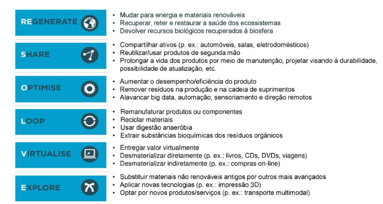 O Quadro ReSOLVE desenvolvido pela McKinsey & Company e segue os princípios básicos da circularidade em seis diferentes ações: Regenerar, (com)Partilhar, Otimizar, Circular, Virtualizar e Trocar.
