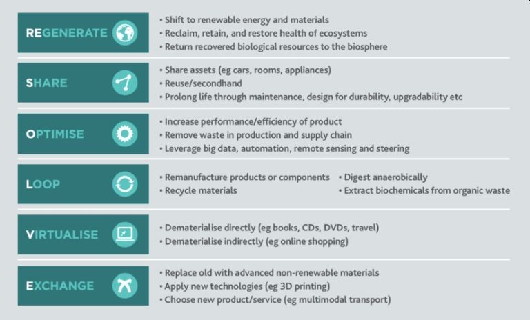 ReSOLVE-ramverket, utvecklat av McKinsey & Company, tar kärnprinciperna för cirkularitet och tillämpar dem på sex åtgärder: Regenerera, dela, optimera, slinga, virtualisera och utbyta.